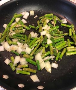 Slice or dice potato depending on preference and peel and dice the onion. Cut off tough bottom sections of asparagus and cut stalks into 1 – 2 inch pieces.